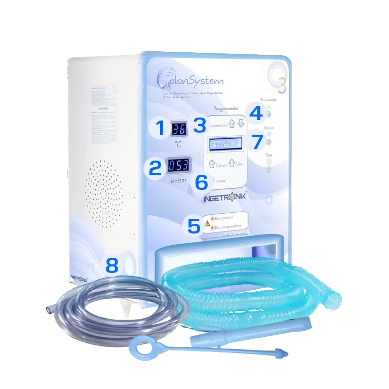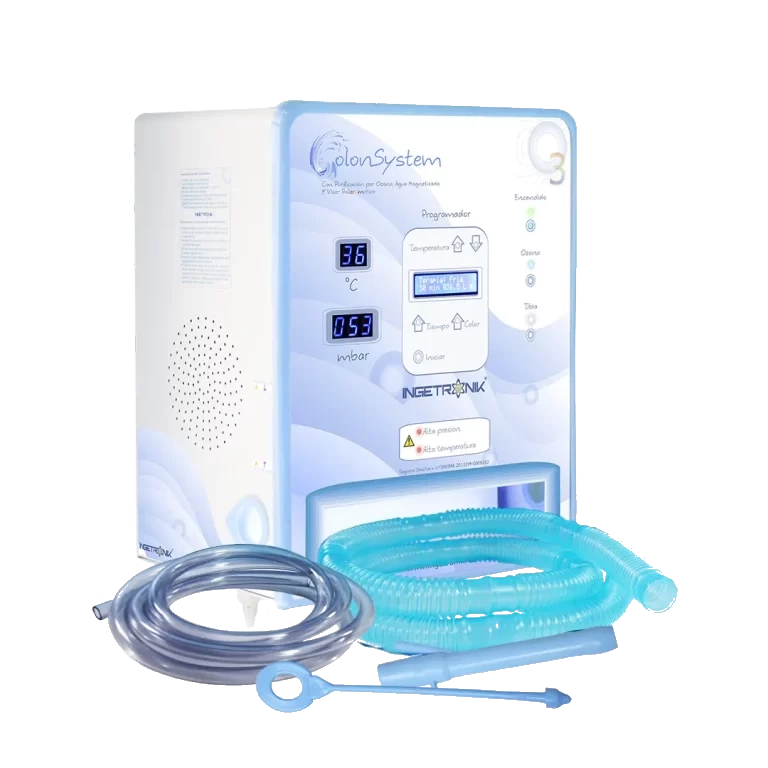 El ColonSystem es un equipo electrónico de última generación diseñado para realizar colonterapias o hidroterapias de colon de forma segura, eficiente y completamente controlada. Su sistema digital monitorea en tiempo real la temperatura, la presión, el flujo del agua y las condiciones del tratamiento, garantizando una experiencia confiable tanto para el especialista como para el paciente.