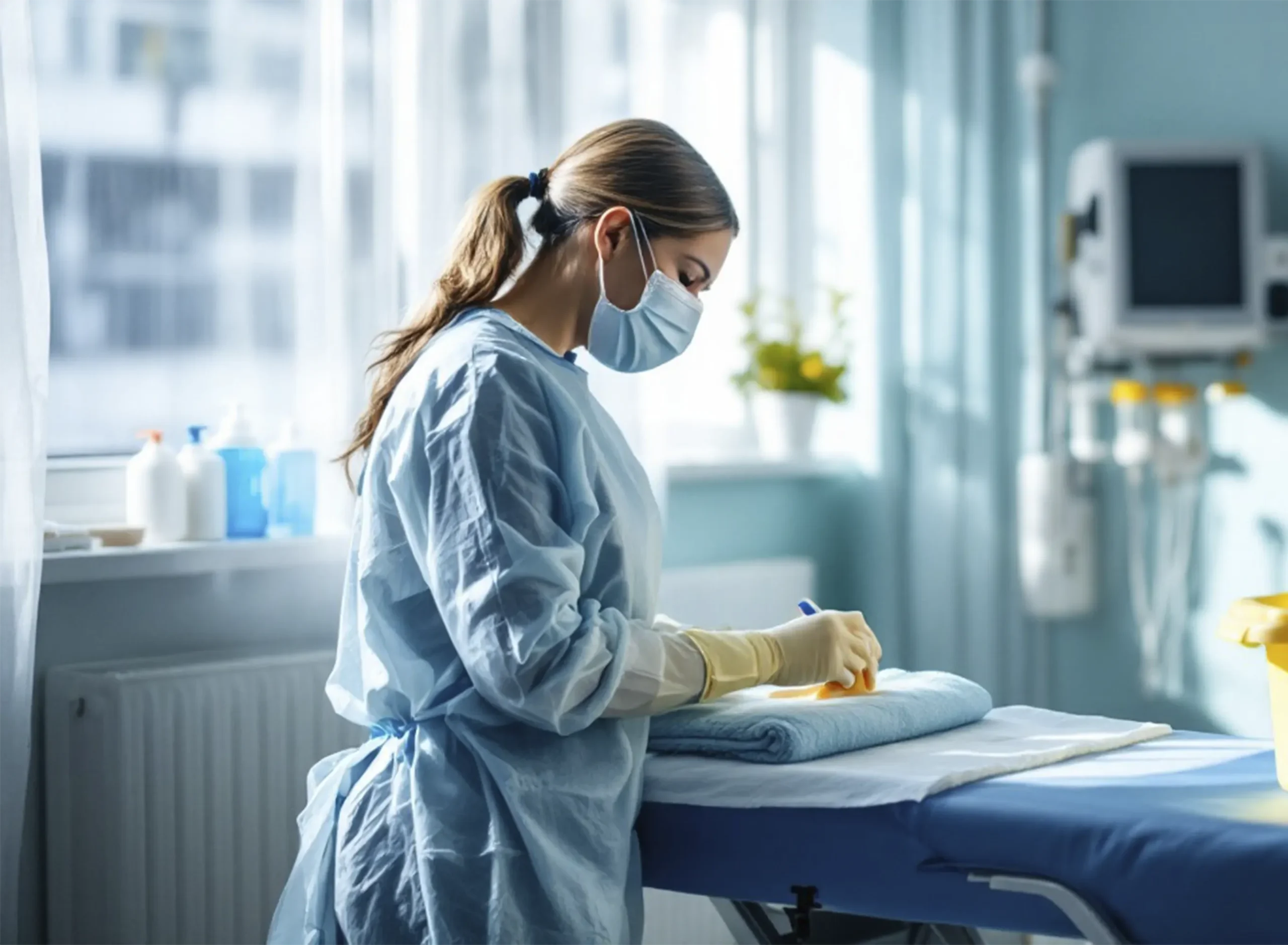 El espacio debe estar limpio, ventilado y equipado con materiales desechables. La mesa o camilla se prepara con sábanas o cobertores estériles, y el profesional debe usar guantes y elementos de protección personal durante todo el procedimiento.
